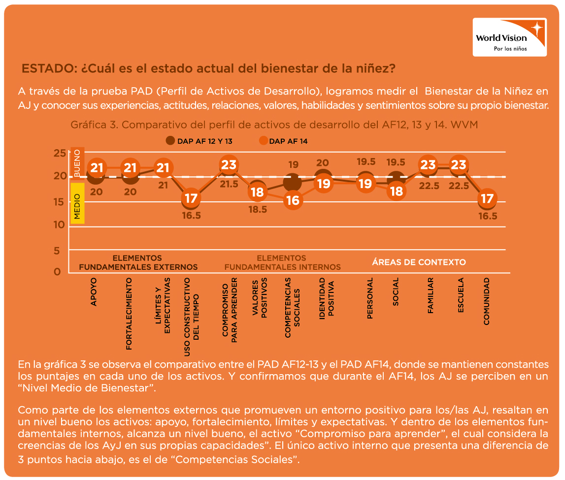 World Visión encuestó a 4 mil 200 adolescentes originarios de los 9 estados donde trabaja la organización, a quienes se les aplicaron una encuesta estandarizada que evalúa su percepción de bienestar en los siguientes temas: su capacidad de aprender, sus valores, su identidad, límites y uso de su tiempo, entre otros. Visto desde los ámbitos