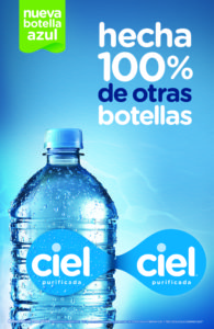 El secreto del tono azul de la nueva botella Ciel está en el uso de tecnología y procesos de reciclaje que transforman el PET de forma segura; es decir, es una botella totalmente reciclada y reciclable que mantiene la calidad y frescura del agua. Cuando depositas la botella vacía en el contenedor de reciclaje, comienza el proceso para crear una nueva botella.