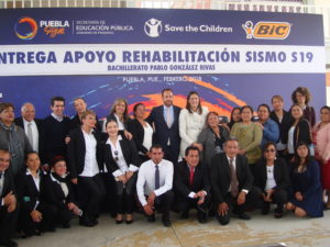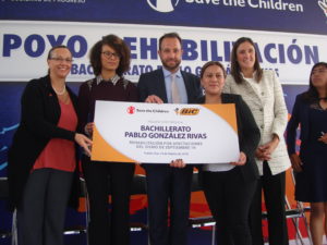 BIC empresa líder en artículos de papelería y en alianza con Save The Children entregó un donativo por más de 850 mil pesos para la reconstrucción del Bachillerato Pablo González Rivas, una de las escuelas afectadas por el sismo del 19 de septiembre de 2017.