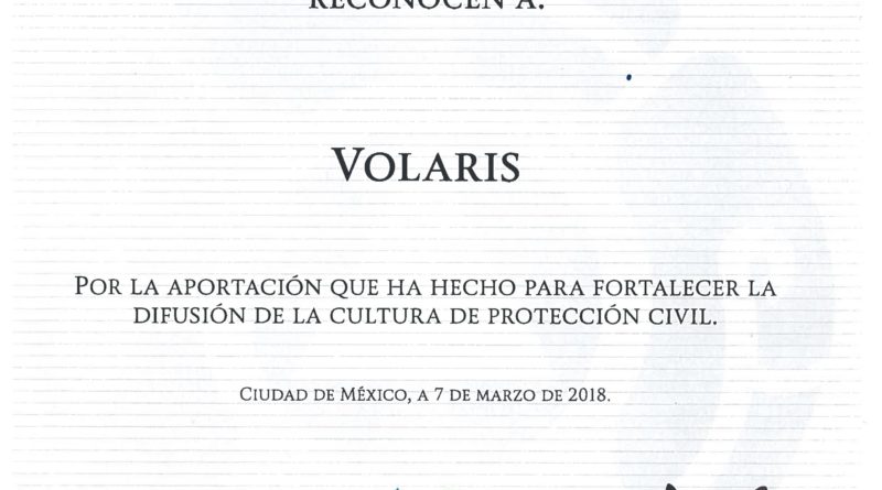 Este reconocimiento premia las iniciativas que la aerolínea ha desarrollado para fortalecer la Difusión de la Cultura de Protección Civil, en apego a la normativa que aplica, y reconoce el interés e importancia que la aerolínea ha demostrado en relación con estos temas. Como antecedentes, Volaris: