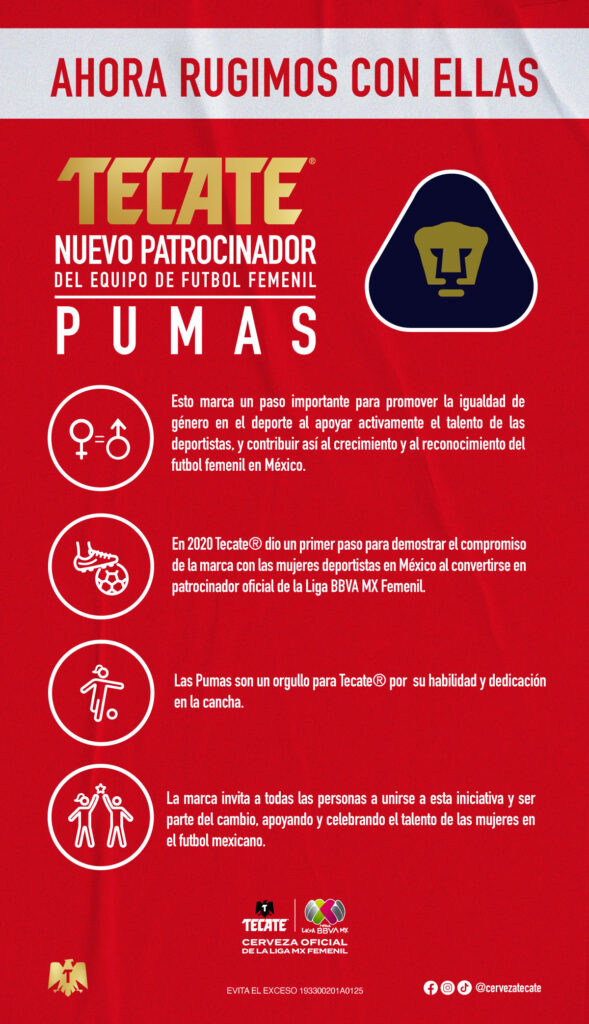 En los dos últimos meses, Tecate ha dado a conocer el patrocinio de los equipos femeniles de las Rayadas y Pumas con el objetivo de promover la igualdad de género en el deporte al apoyar activamente el talento de las deportistas, y contribuir así al crecimiento y al reconocimiento del futbol femenil en México.