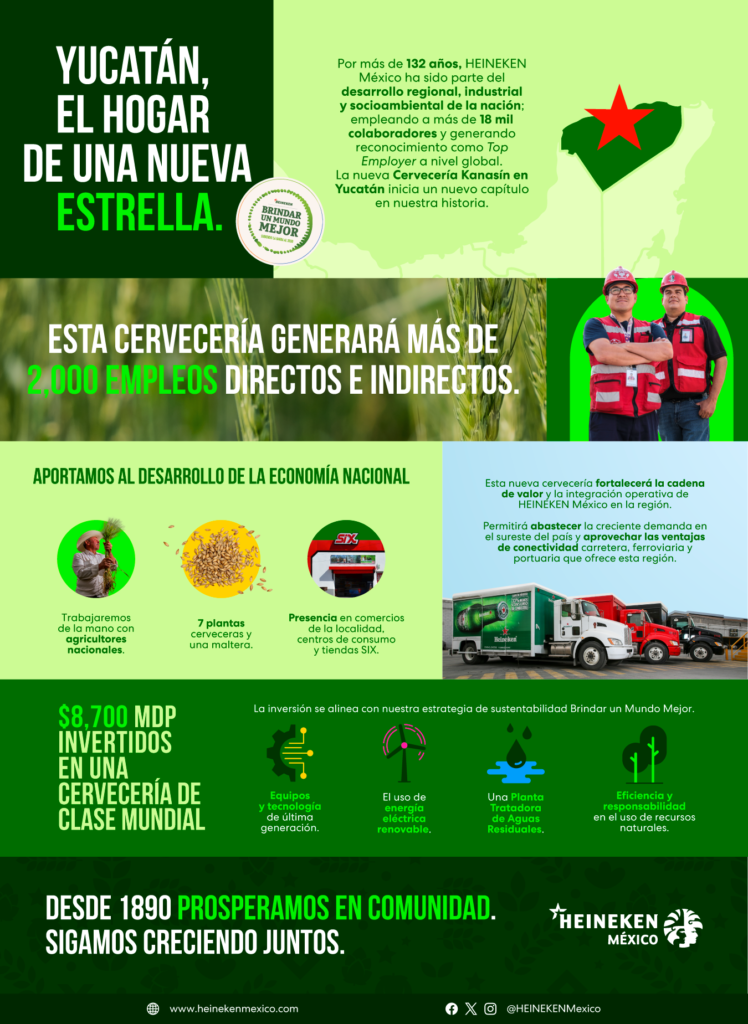 Para lograrlo, Heineken México invertirá 8,700 millones de pesos en Yucatán para construir una cervecería de clase mundial, generando más de 2,000 empleos directos e indirectos.