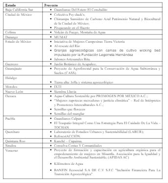 Los 28 proyectos seleccionados, provenientes de diferentes estados del país, han sido elegidos por su potencial transformador en la conservación del agua, la biodiversidad y el clima y obtendrán mentorías especializadas así como apoyo de expertos en sustentabilidad y emprendimiento para aumentar sus capacidades y amplificar el impacto de sus iniciativas mediante la colaboración busca facilitar nuevas alianzas con empresas e instituciones de cooperación internacional para fortalecer los proyectos.