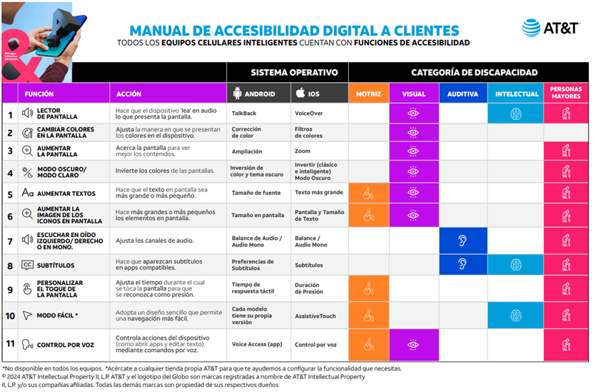 AT&T México también elaboró un Manual de Accesibilidad Digital a Clientes para capacitar a su fuerza de ventas a nivel nacional en funciones y herramientas de accesibilidad de los sistemas operativos Android y IOS disponibles en los teléfonos inteligentes, para adaptarlos según las necesidades de cada cliente, como se muestra en la siguiente tabla: