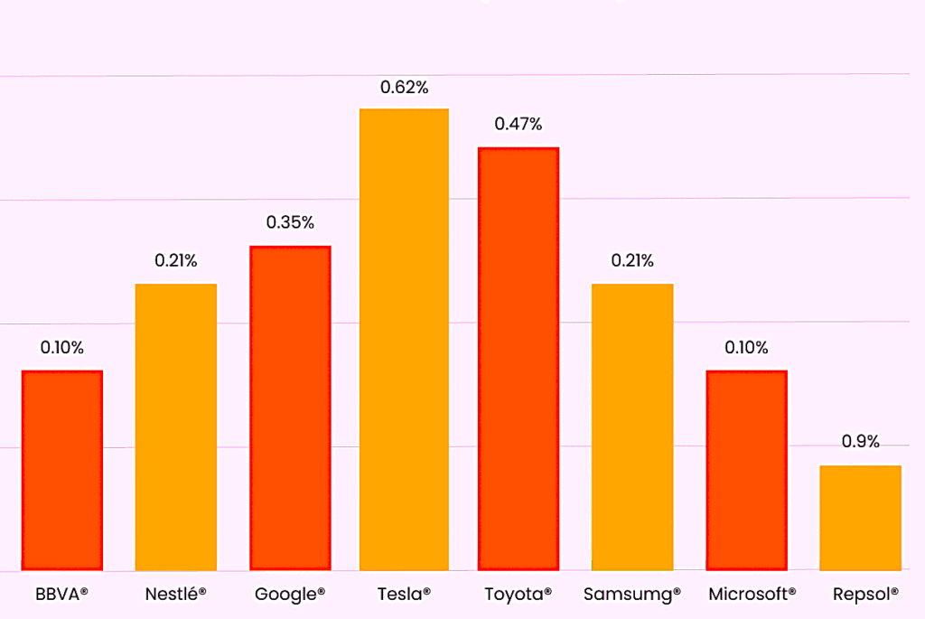Toyota: 0.47%, reconocida por su apuesta constante por los vehículos híbridos y su innovador proyecto urbano Woven City.