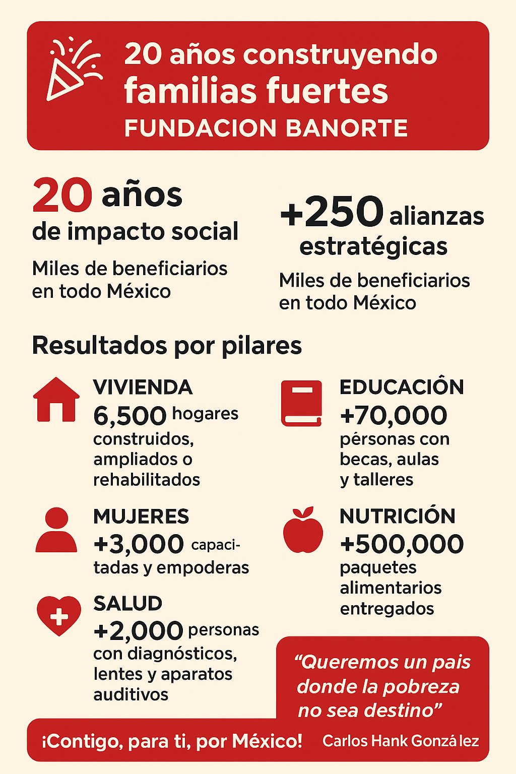En 20 años hemos demostrado que la unión de esfuerzos puede cambiar destinos. La visión de Fundación Banorte seguirá siendo clara: fortalecer a las familias para construir un país más justo y equitativo”, indicóHank González.
