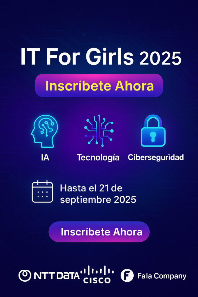 Dirigido a mujeres mayores de 18 años, tanto principiantes como aquellas en transición de carrera, el programa IT for Girls 2025 ofrece clases en vivo con especialistas en IA, Cloud, Ciberseguridad y Desarrollo de Software, además de contenidos prácticos alineados al mercado laboral.