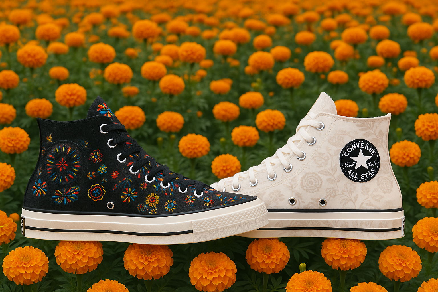 Cada par de Chuck Taylor All Star cuenta una historia en sus detalles: un modelo color hueso con estampados tono sobre tono que evocan sobriedad y memoria yotro en negro, vibrante y lleno de vida, con gráficos que celebran nuestra tradición.