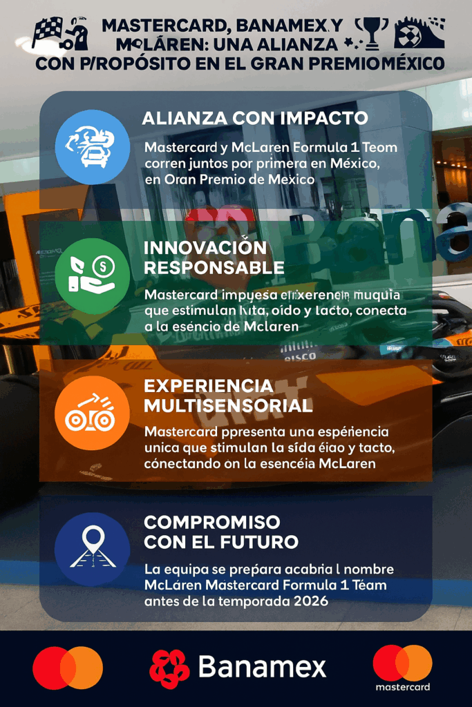 La colaboración fue anunciada a finales del 2024, se materializa en México con una presencia emblemática así es como los monoplazas de Lando Norris y Oscar Piastri lucirán los logotipos de Mastercard y Banamex, simbolizando la unión entre la innovación tecnológica y el legado de una institución mexica eque logra prescenia en la F1, esta alianza es para fortalecer comunidades, inspirar a nuevas generaciones y promover valores de sostenibilidad y equidad.